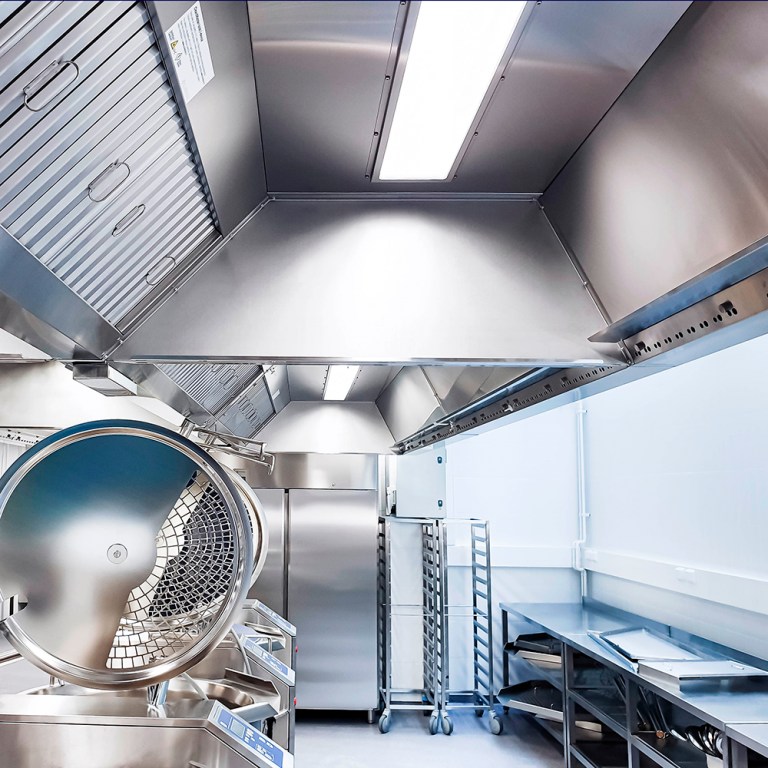 Wir bieten umfassende Designdienstleistungen für große professionelle Küchen und gewährleisten nicht nur funktionale Lüftungslösungen für eine professionelle Küche, sondern auch gute Arbeitsbedingungen in Bezug auf die Beleuchtung.