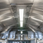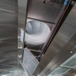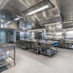 ”Suunnittelussa, mitoituksessa ja laitevalinnoissa piti kiinnittää erityishuomiota siihen, että ilmaa saadaan suunnattua tarpeeksi laajalle alueelle tarpeeksi pienellä nopeudella vedon tunteen välttämiseksi. Piti varmistaa, että työskentely- ja käytäväalueet hyödynnetään mahdollisimman tehokkaasti valtavien tuloilmamäärien tuomiseen”, kertoo Esa. Ilmanvaihtokattojen avulla pystyttiin kattamaan opetuskeittiöiden laajat alueet ja suuret ilmamäärät. Myös katon korkeat palkit rajoittivat laitteiden asettelua ja niiden väliin tehtävää kanavointia. IV-kattojen ja poistoilmalaitteiden liitäntäyhteiden paikkoja jouduttiin räätälöimään sen mukaan, miten niitä saatiin tuotua palkkien väleihin.