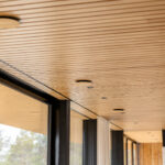 LINE Accoyan raaka-ainepuu hankitaan kestävästi viljellyistä, sertifioiduista mäntymetsistä. Accoyan ainutlaatuinen, ekologinen etikkakäsittely tekee puusta lujan ja kestävän. Ne ovat saatavilla käsittelemättöminä, jolloin ne voidaan pintakäsitellä sisustuksen värimaailman mukaan kuten tässä kohteessa on tehty. Kohteen sisustuksessa on käytetty puun kumppanina kontrastina sinivihreää. Vihreän eri sävyt sointuvat puun kanssa hyvin yhteen ja liittää sisustuksen kodikkaasti luontoon.