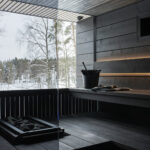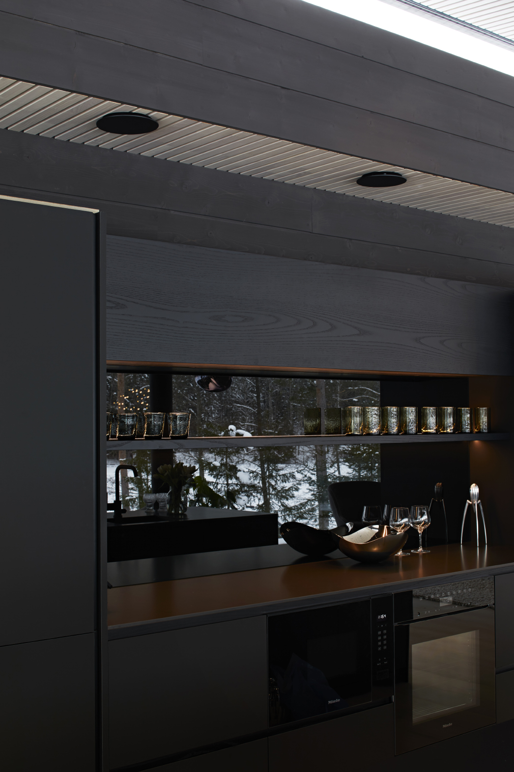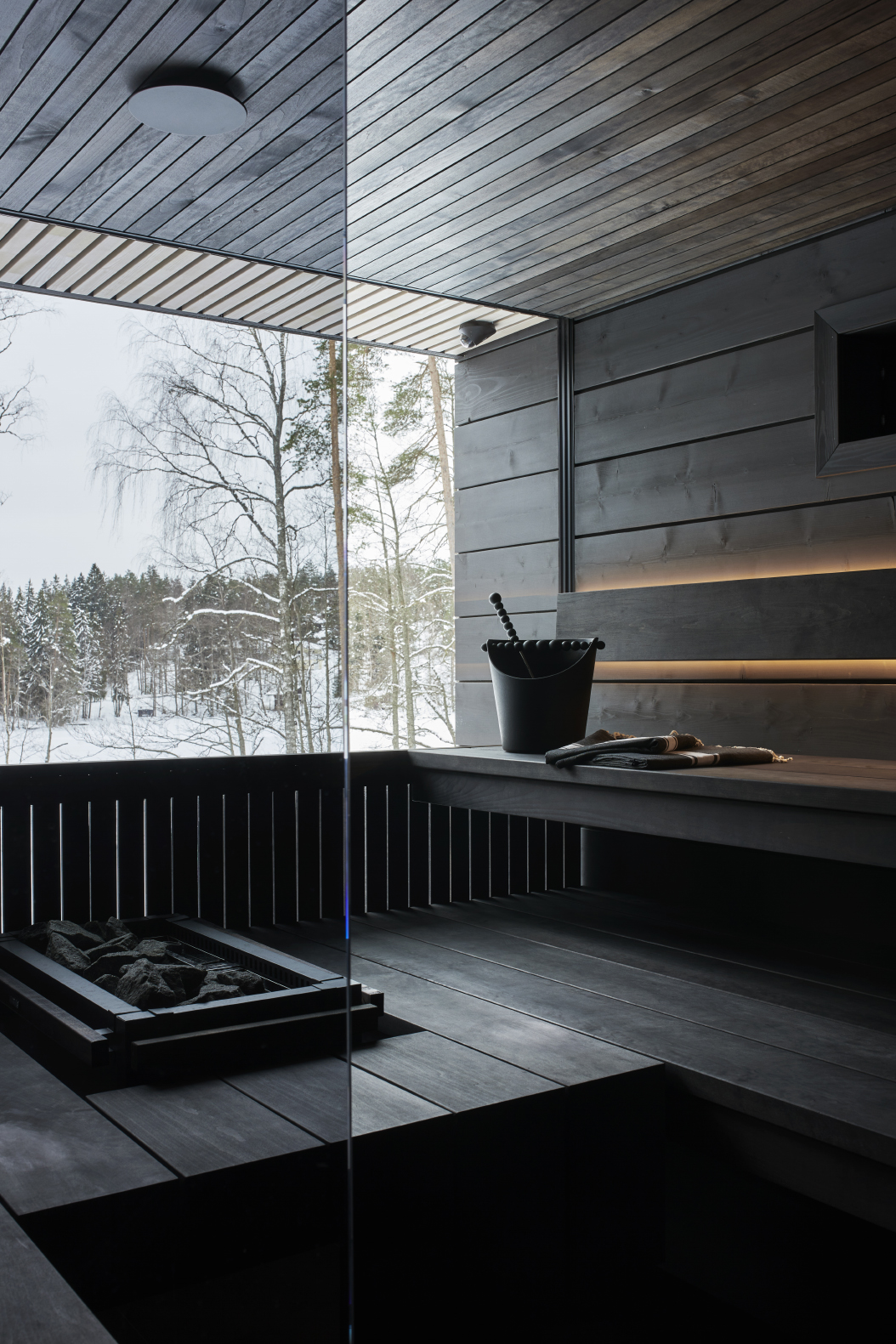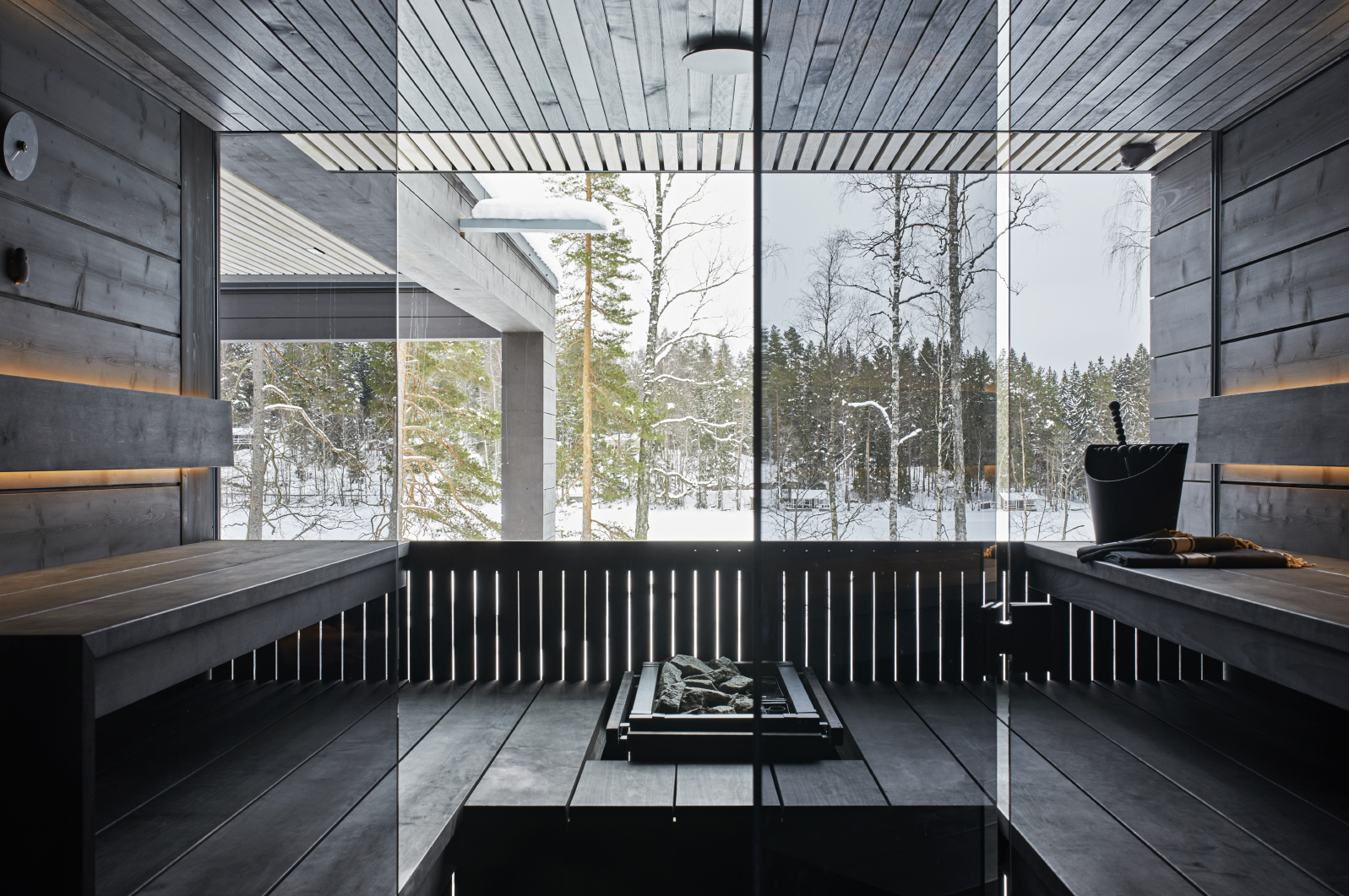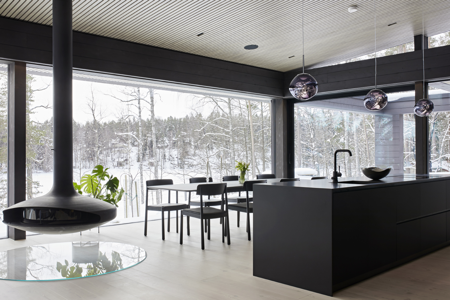 The interior of the house was designed by interior architect Antti-Jussi Silvennoinen from Franz Desing Oy, and the architect of the house is Seppo Mäntylä. A minimalist style that reflects its owner was sought after. Huge windows spanning from the ceiling down to the floor bring the serenity of the surrounding forest into the house. The seamless connection to nature can also be seen in the material choices of the interior. Matching-tone wood has been used on both the floor and in the ceiling, and all surfaces are ceramic.