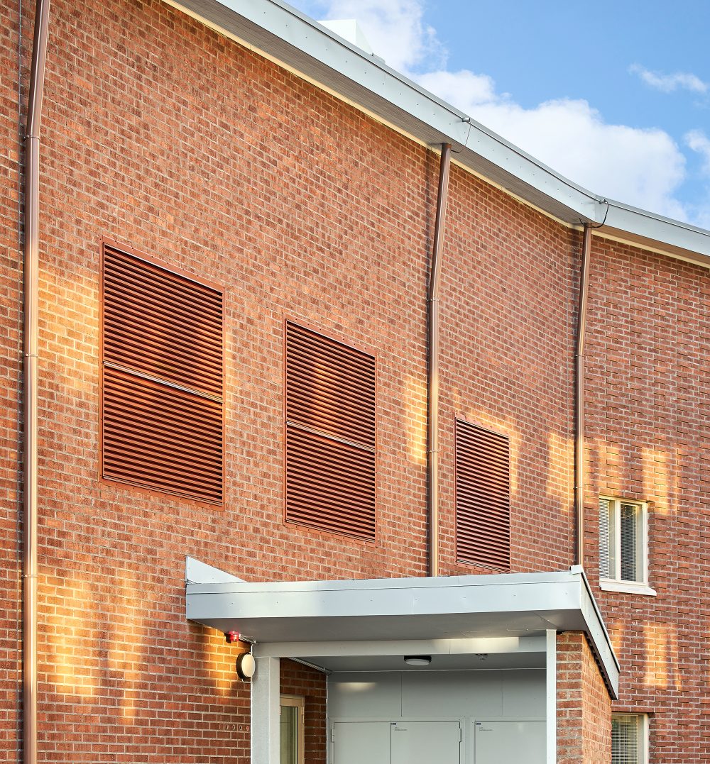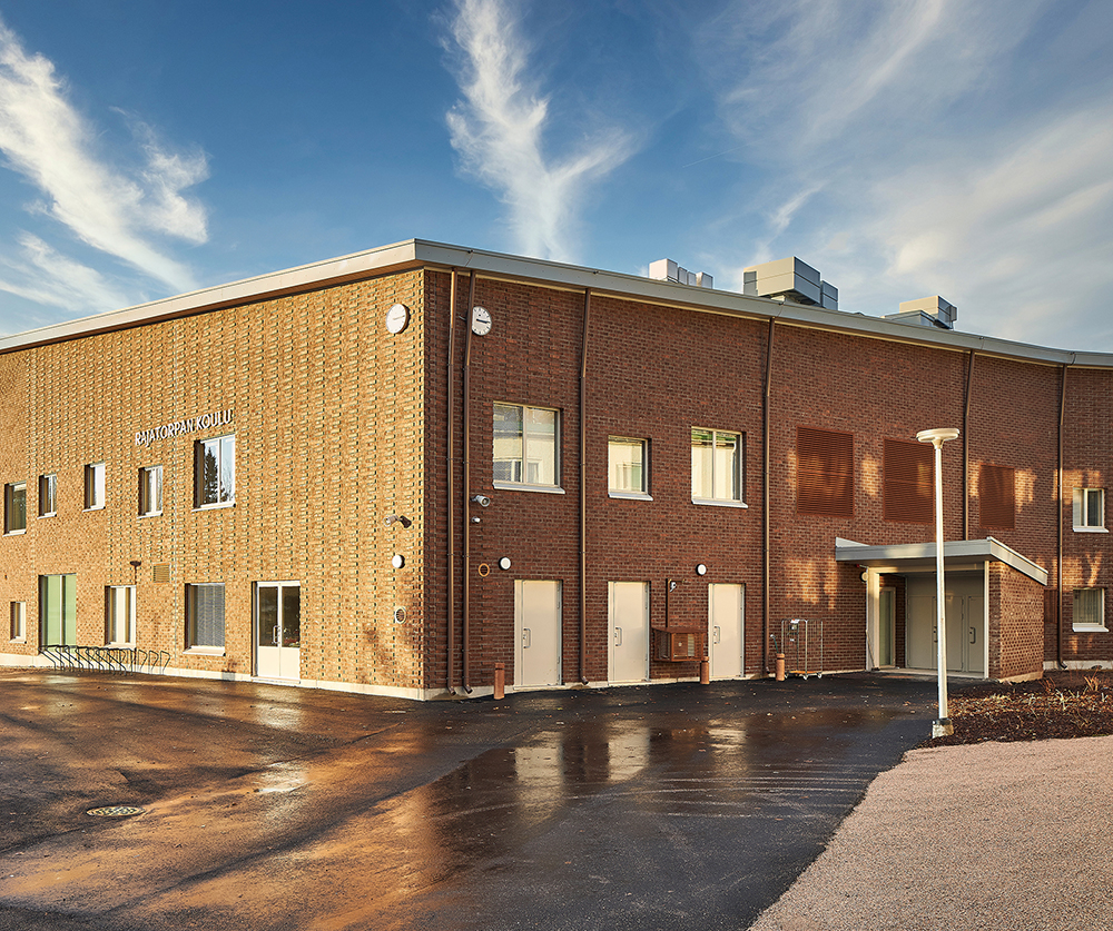 Till den nya tjusiga skolan valde man Climecons infällbara TUISKU med vågrätt galler som garanterar att ventilationen i skolan inte störs av hårda vindar. Även Vikke Niskanen (Granlund Oy), som är byggnadens VVS-planerare, stöder snöskyddet för infälld installation med vågrätt galler TUISKU-VU och konstaterar att det är ”POP”. Enligt Vikke är TUISKU-VU speciell för att den är infällbar och har vågräta galler, eftersom arkitekter vanligen uppskattar infällda produkter. Den murade väggytan medförde utmaningar för snöskyddens utseende, men slutresultatet är att de inte är iögonfallande på väggytan.